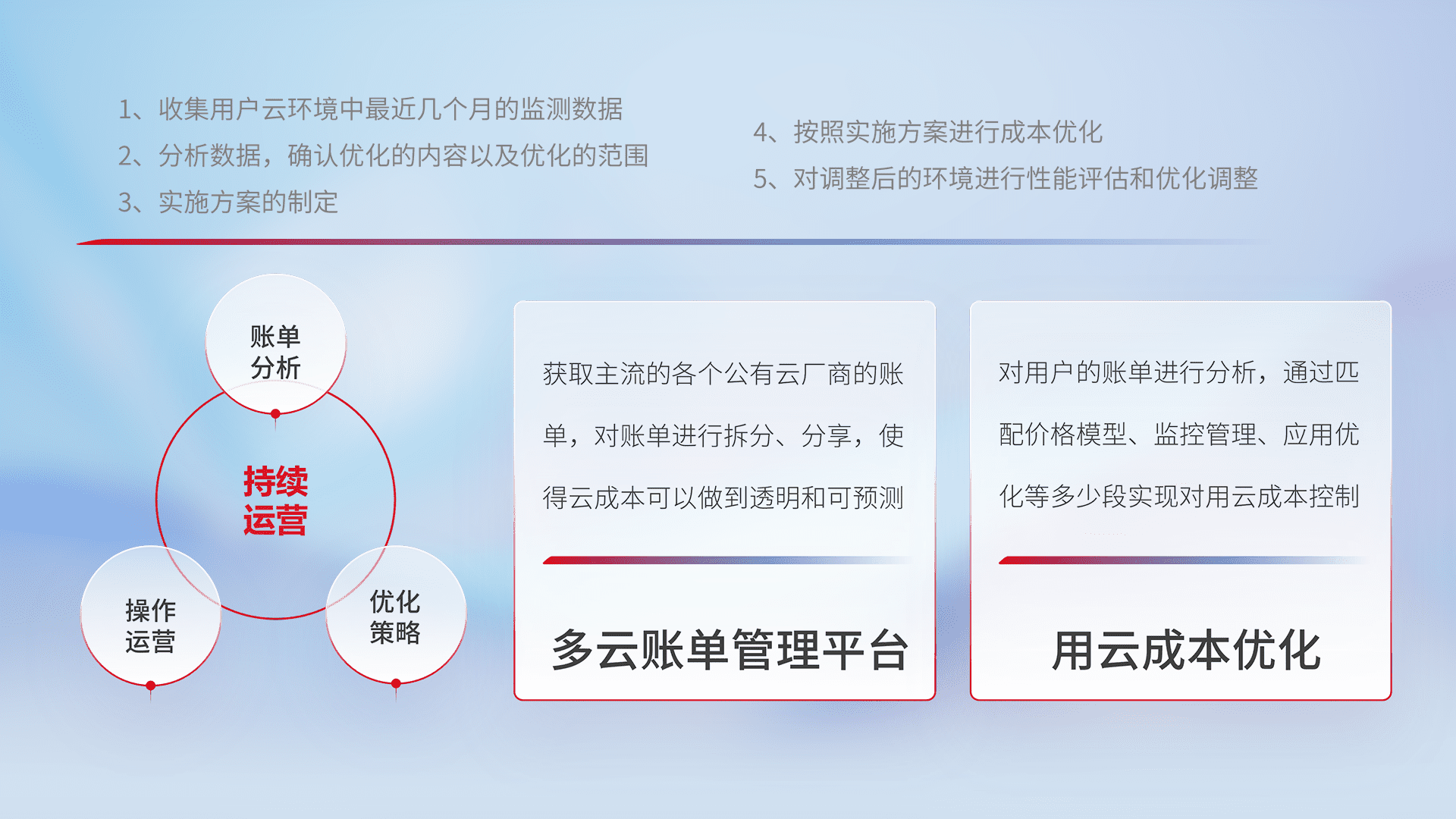 通过多云纳管,,以统一的资源数据模型把客户的云资源进行抽象和封装,,,进而实现对多云资源的统一操作,,保障云资源管理的可靠性、、、稳定性与可用性。。。。量身定制化运维内容,,配置、、、、开发运维、、、补丁管理、、、、备份、、、、监控、、认证和访问管理、、审计和日常巡检等,,,,保障在用云过程中的可靠度,,,稳定度以及高可用率。。